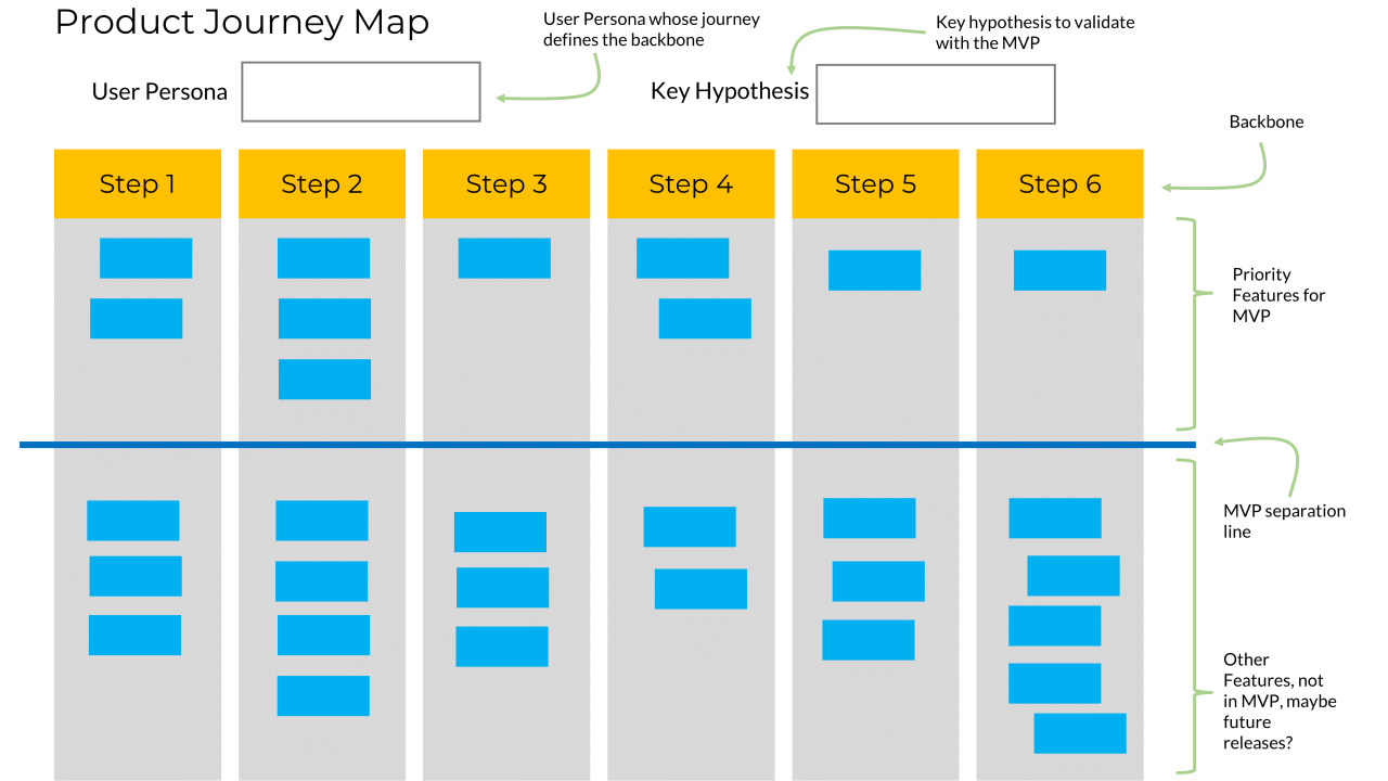 This is where the Product Journey Map becomes essential. Unlike a roadmap, the Product Journey Map is a decision-making framework. It forces you to map every potential feature to a specific milestone in the user’s experience. It forces you to think if you really need that feature right now, or if it can wait. It helps you to focus on the core features that are needed to test and validate your core hypotheses, rather than padding the product with “nice-to-haves”.